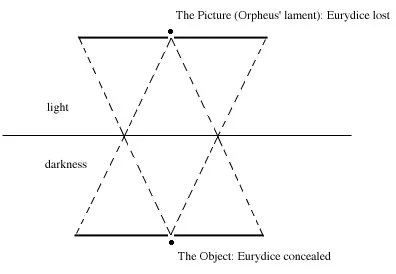 In “The Gaze of Orpheus” Blanchot suggests that turning away from nature is the power of art—that the work of art is “not to see Eurydice clearly; rather, the artist’s job is to bring [Eurydice] back into the daylight and in the daylight give [her] form, figure and reality.” (Quote & Diagram Blanchot, 99) Like Ponge, Blanchot worries about what is real and what is not. The ecstasy, then, is not just the imbrication of the self in the past, but that the present too shall fall to darkness.
